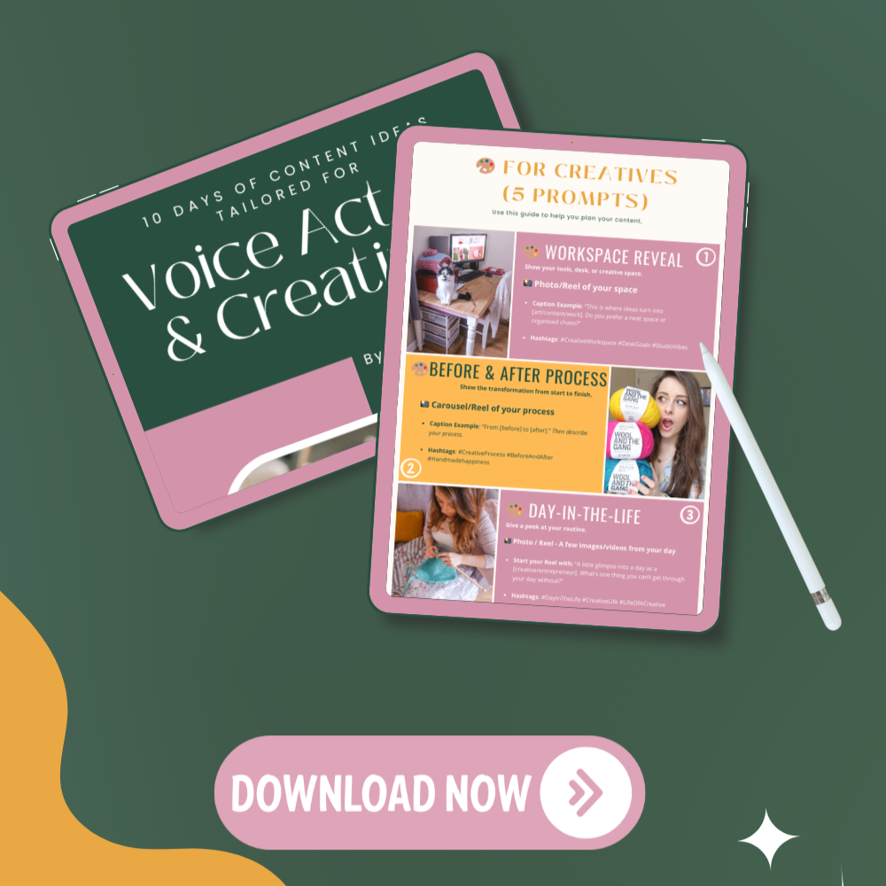 ✨ Free Social Media Tools for Voice Actors& Creatives Free Resources Hub 10 Social Media Content Ideas for Voice Actors & Creatives £0.00 Free Download Added! 30-Minute Social Media Content Planner £0.00 Download Now Added! 5-Day Instagram Profile Refresh for Creatives & Voice Actors £0.00 Free Download Added!